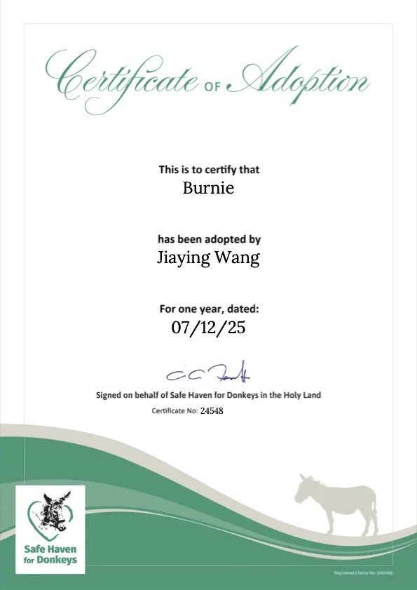 We have adopted a 22 years donkey called Burnie at Palestine since 2025.